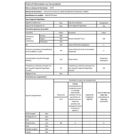 | Volume compartiment denrées alimentaires fraîches (L) | 88 |