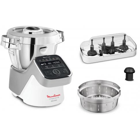 | Accessoire(s) inclus | Bol inox poli, Couteau hachoir, Couteau pétrin/concasseur, Batteur, Mélangeur, Panier vapeur, Accessoire fond plat, Spatule, Livre de recettes »1 million de menus », Couvercle verre et métal, Boîte de rangement des accessoires |